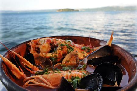 Die stets aktualisierte Speisekarte bietet unter anderem: eine Auswahl an gemischten Vorspeisen, die köstliche Fischsuppe, serviert in noch dampfenden Tontöpfen, sowie die Fettuccine „all’Otello“ mit Venusmuscheln, Lachs und Pilzen.